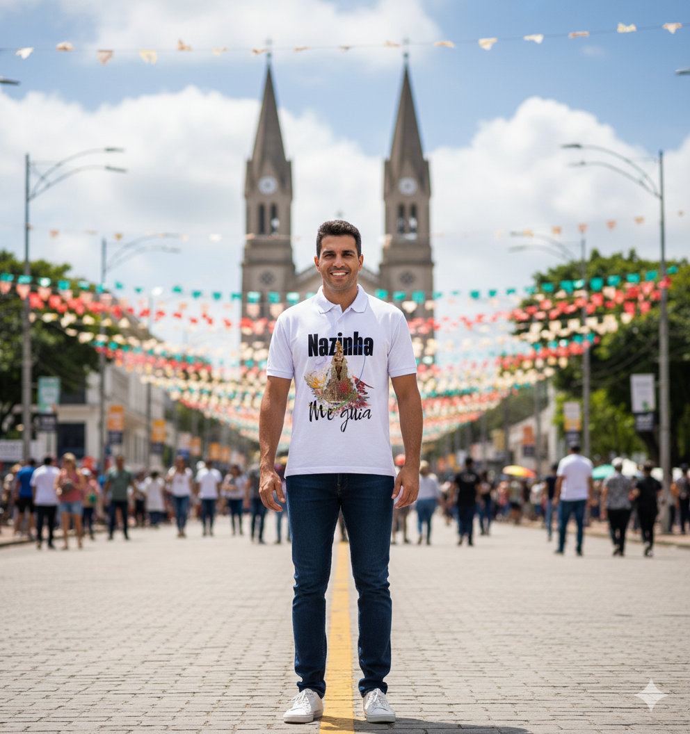 A arte "Nazinha Me Guia" traz a imagem da nossa padroeira, a Nazinha, em uma releitura vibrante que mistura elementos gráficos modernos com a iconografia tradicional. É a peça ideal para quem busca expressar sua devoção de uma forma autêntica e estilosa.