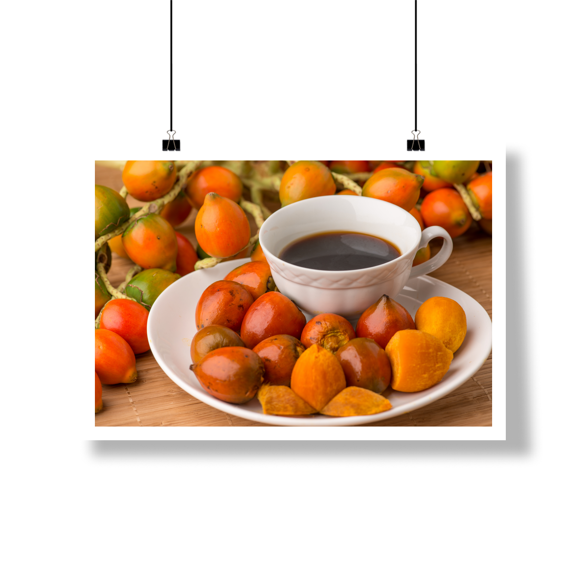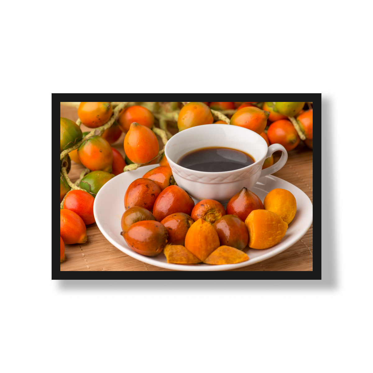 Existe combinação mais afetiva e paraense que esta? Este quadro celebra um dos maiores clássicos do nosso cotidiano: a pupunha quentinha com um bom café preto.