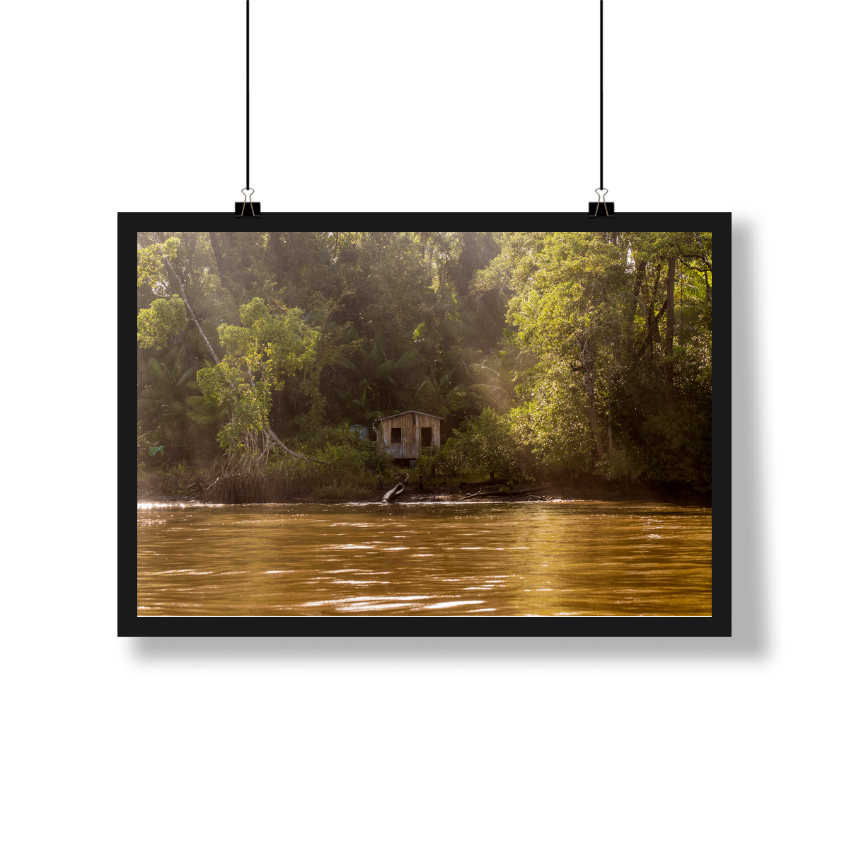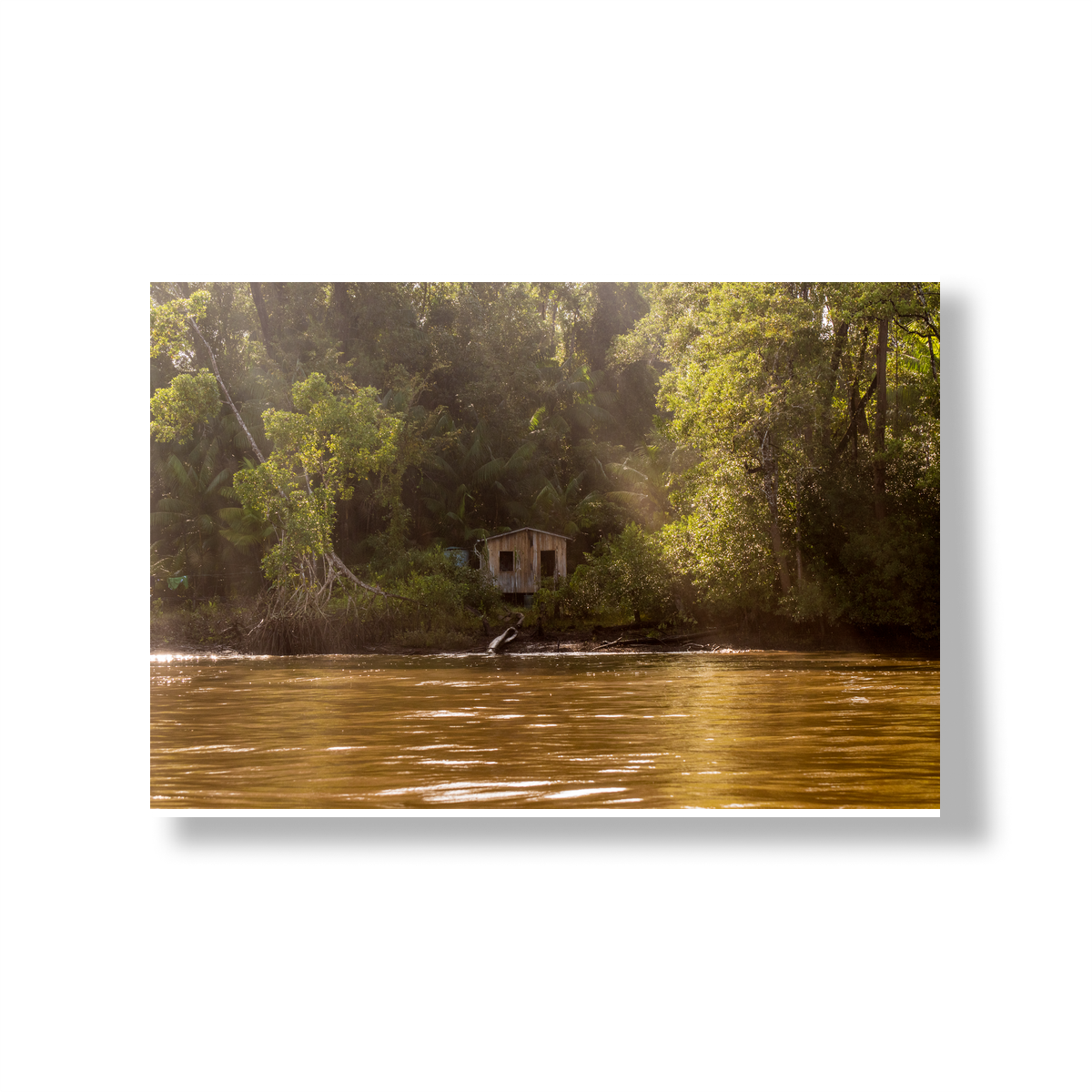 Há uma beleza profunda na simplicidade da vida amazônica. Este quadro é uma janela para esse universo: uma morada ribeirinha que surge em meio à imensidão da floresta, banhada por uma luz suave que atravessa a copa das árvores.